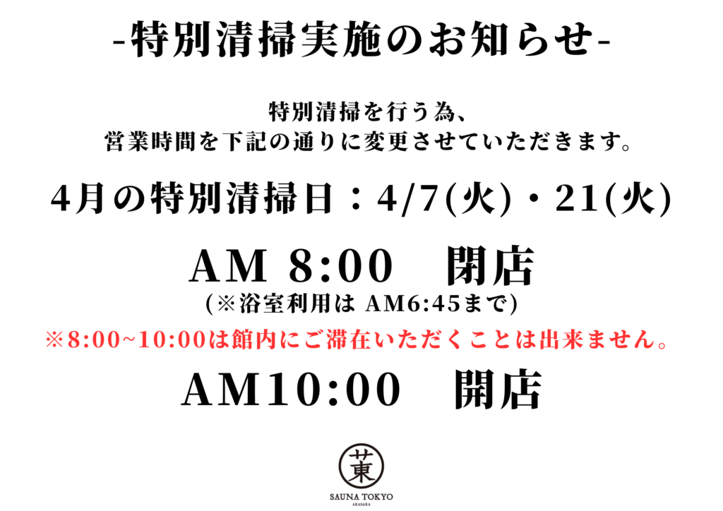 【特別清掃に伴う営業時間変更のご案内】